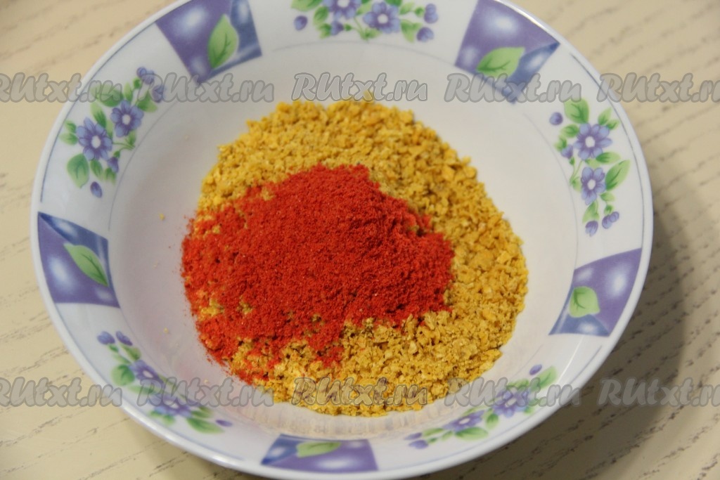 В крошку из чипсов можно добавить немного паприки, тщательно перемешать. Паприка придаст крошке из чипсов цвет и аромат.