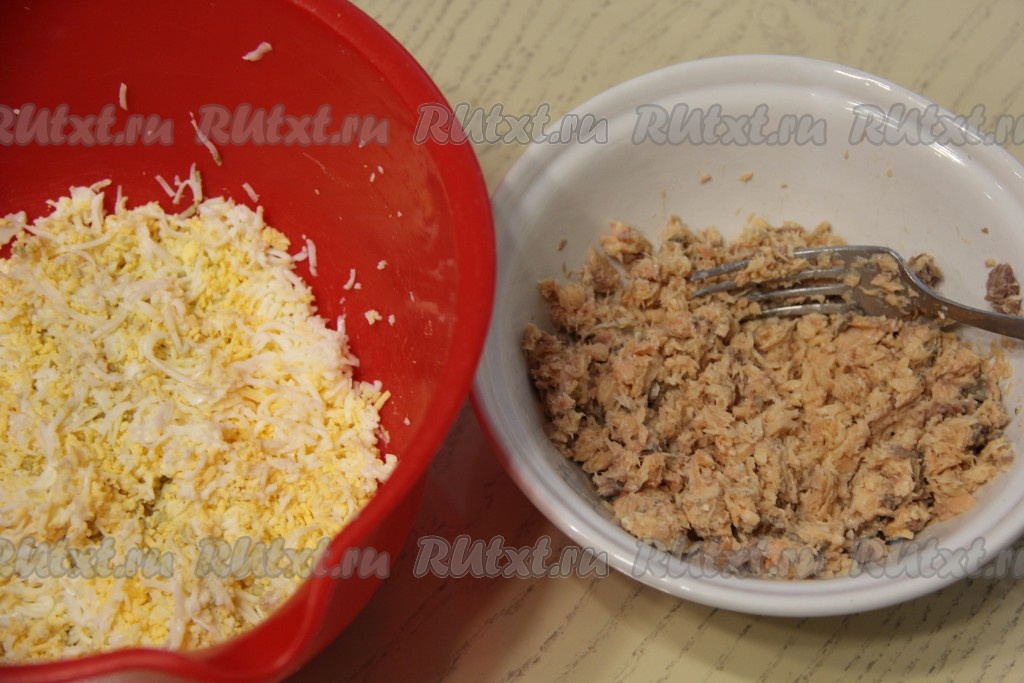 Консервированную горбушу из банки переложить в небольшую миску, если жидкости в баночке много, её лучше слить (она нам не понадобится). Крупные косточки из рыбы нужно удалить, а затем размять горбушу вилкой. В другую тарелку натереть на мелкой тёрке яйца.