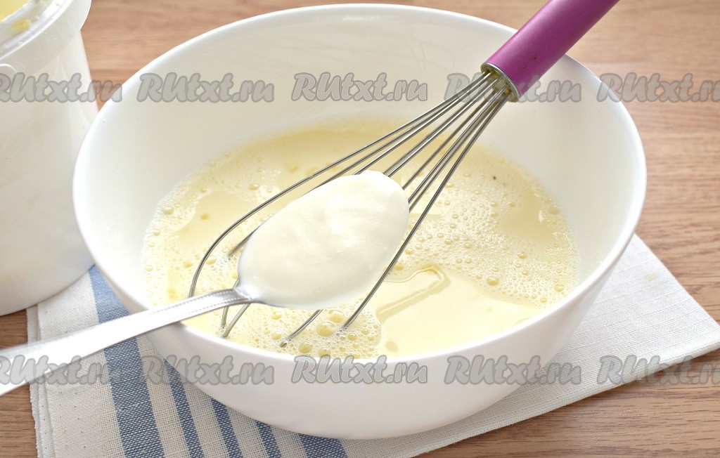 Сметану и яйца заранее достаньте из холодильника, чтобы они стали комнатной температуры. Молоко переливаем в ковшик и немного прогреваем, чтобы оно стало тёплым. В миску разбиваем яйца, всыпаем соль и сахар. Количество сахара - на ваш вкус, я добавила 2 столовые ложки, по желанию, можно добавить немного меньше сахара.