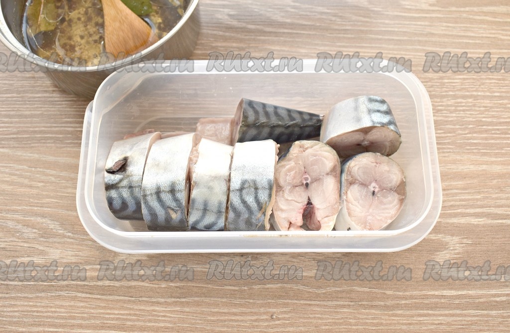 Скумбрию нарезаем на кусочки шириной 2,5 см. Кусочки рыбки выкладываем в контейнер (или стеклянную банку).