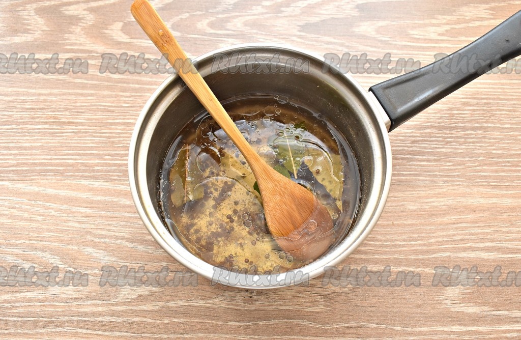 Рассол в ковшике доводим до кипения, провариваем 2 минуты и снимаем с огня. В горячий рассол вливаем растительное масло и столовый уксус. С уксусом «не переборщите», его нужно не больше половины столовой ложки. Даём рассолу полностью остыть.