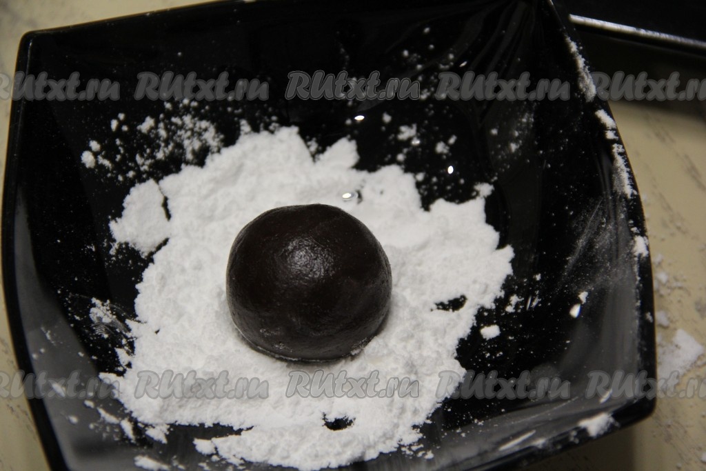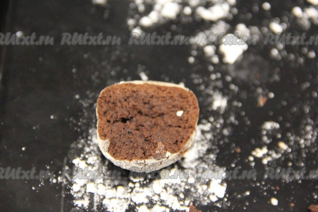 Сформировать из теста шарики любой формы (я сформировала шарики весом по 30 грамм). В небольшую пиалу насыпать 30 грамм сахарной пудры. Обвалять сформированные шарики со всех сторон в сахарной пудре.