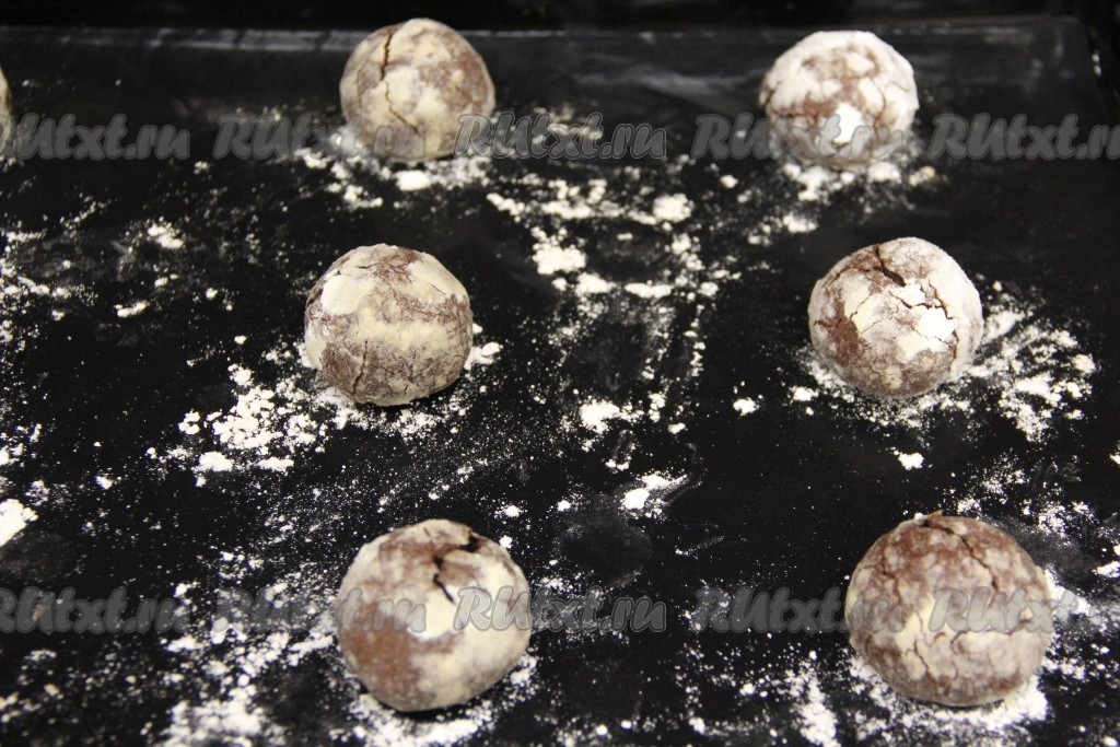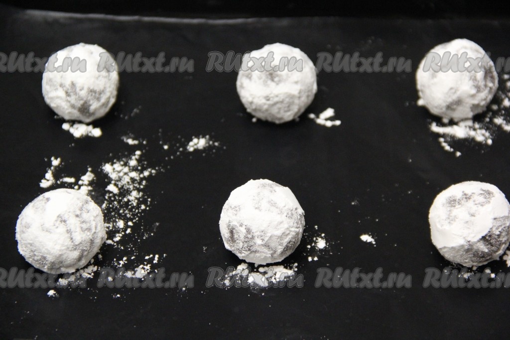 Шарики, обваленные в сахарной пудре, выкладывать на противень, застеленный пергаментом (или силиконовым ковриком для выпечки).