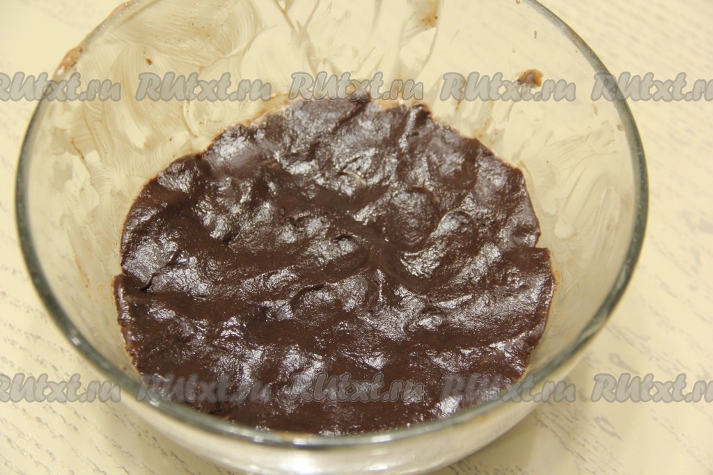 Всыпать сухие ингредиенты в миску с яично-масляной смесью и перемешать тесто. Шоколад растопить на водяной бане (или в микроволновке), немного остудить и добавить в тесто.