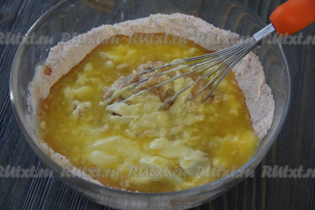 Сливочное масло растопить (например, в микроволновке). Не горячее сливочное масло влить к смеси сухих ингредиентов и яйцам.