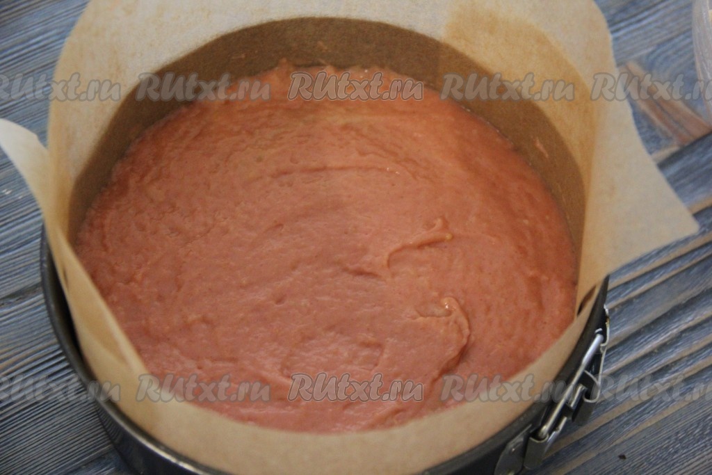 Выстелить пергаментом форму для выпечки (я использовала разъёмную форму диаметром 20 см), выложить тесто. Выпекать кекс из сухого киселя в духовке, разогретой до 180 градусов, минут 40.