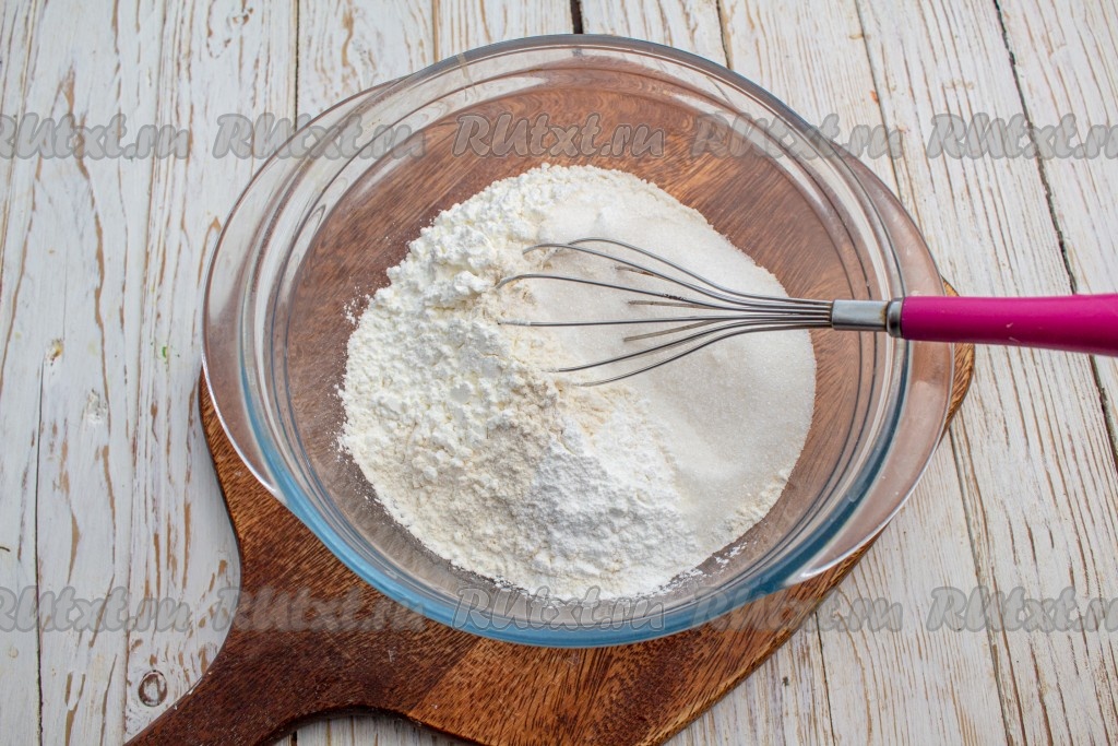 Добавьте сахар и кукурузный крахмал. Венчиком перемешайте сухие ингредиенты. Кукурузный крахмал можно заменить на картофельный. Можно крахмал и вовсе не добавлять, но тогда нужно добавить вместо крахмала такое же количество муки (в данном случае 1 столовую ложку).
