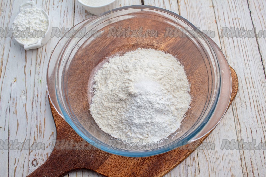 В миску просейте муку, соль и разрыхлитель.