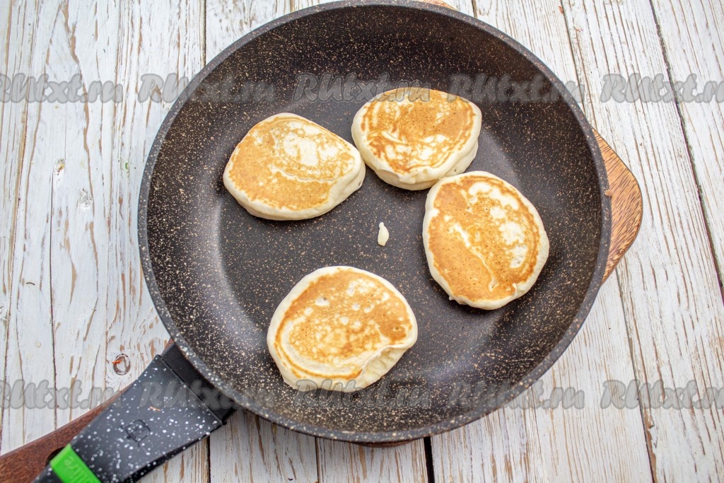 Для жарки оладий лучше выбрать сковороду с хорошим антипригарным покрытием, тогда не нужно будет её смазывать маслом. Если не уверены в своей сковороде, то смазывайте её маслом перед выпечкой каждой партии оладушек. Хорошо раскалите сковороду, выкладывайте по столовой ложке теста и жарьте на среднем огне с одной стороны 1-2 минуты (до подрумянивания), затем переверните оладушки и жарьте ещё с минутку под крышкой. Готовые оладьи переложите на тарелку. Постепенно испеките все оладушки.