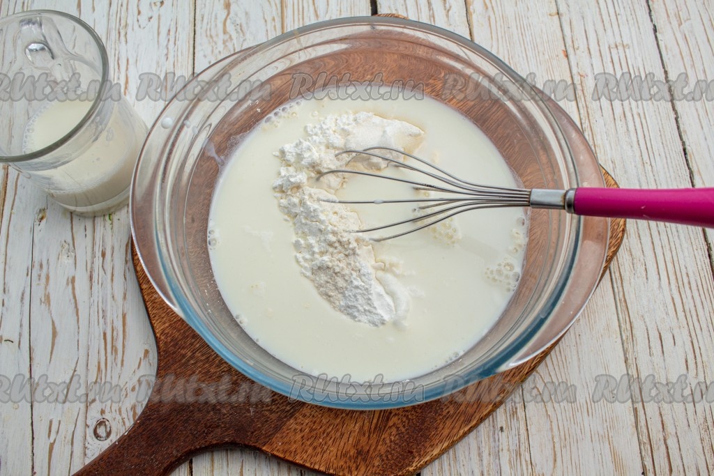 Молоко подогрейте, оно должно стать тёплым (подогревать удобно в микроволновке в течение 20 секунд или на плите). В миску с сухими ингредиентами понемногу вливайте молоко, при этом постоянно перемешивая тесто венчиком, таким образом тесто получится без комочков. Можно для перемешивания использовать миксер.