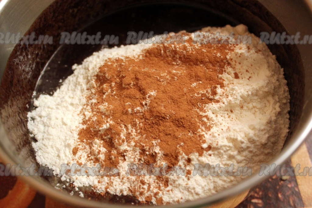 Затем в смесь масла и шоколада добавить сахар, муку, корицу и перемешать тесто.