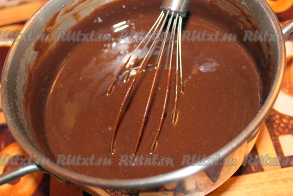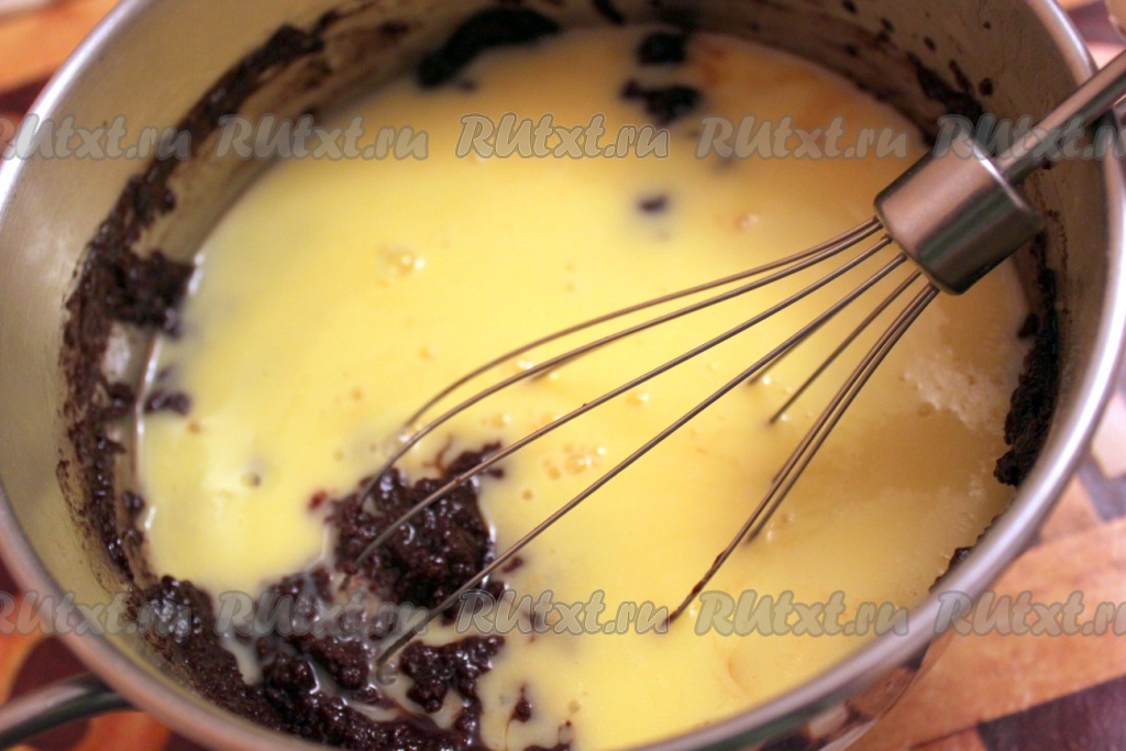 Для приготовления теста первым делом нужно растопить сливочное масло с кусочками шоколада.