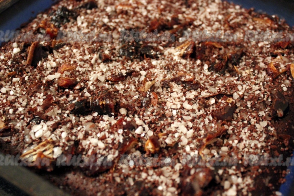 Затем готовый горячий финиковый кекс посыпать мятной карамельной крошкой.