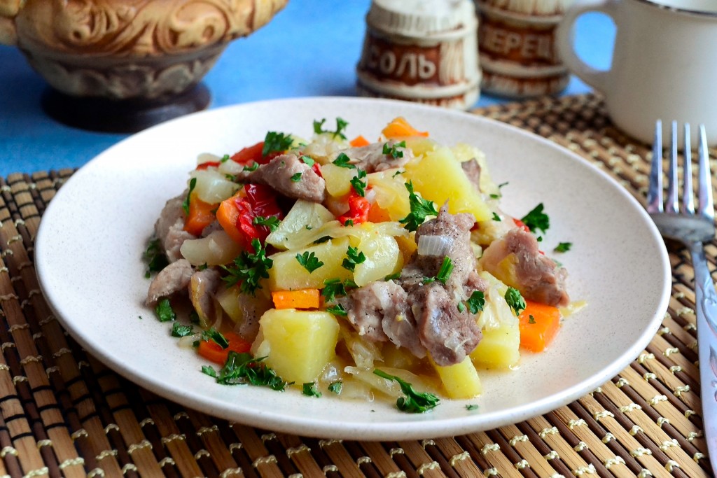 Тушёную картошку с капустой и мясом можно подать прямо в горшочках или выложить на тарелку. Кушать только в горячем виде. Томлёная картошечка пропитывается мясными соками, а капуста, морковка и лук отлично дополняют это наивкуснейшее блюдо.