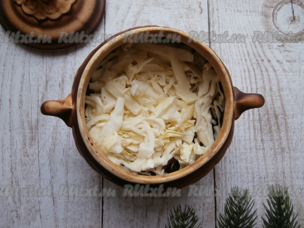 Поверх свинины выложить капусту, чуть посолить.