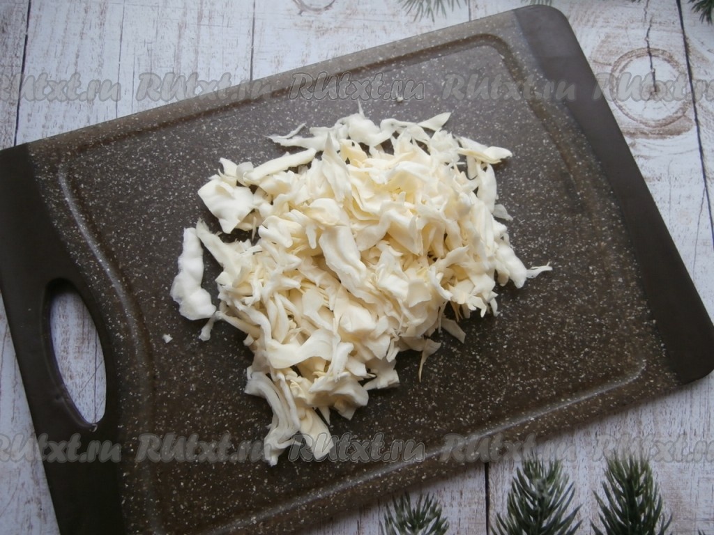 Капусту нарезать и немного помять её руками.
