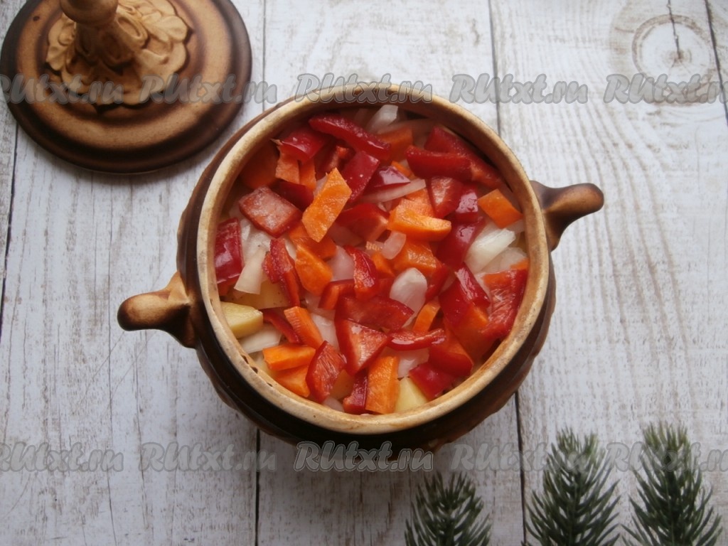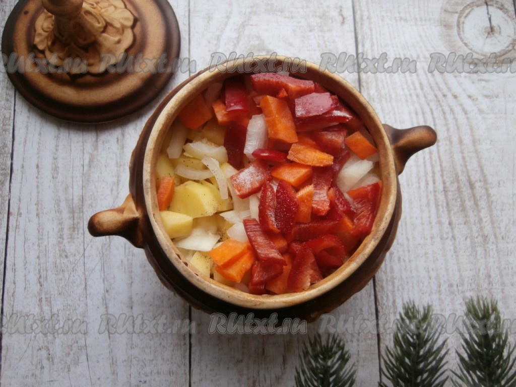 Далее распределить по горшочкам картофель, лук, морковь и болгарский перец. Посолить овощи сверху и поперчить.