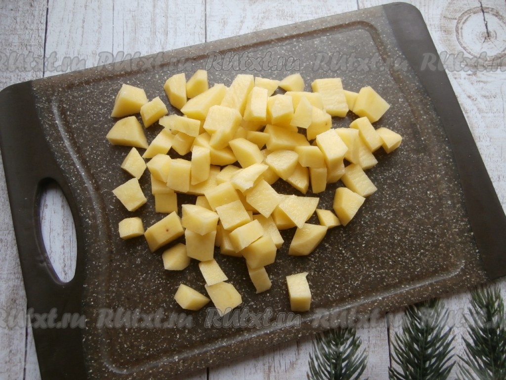 Нарезать на кубики очищенный картофель.