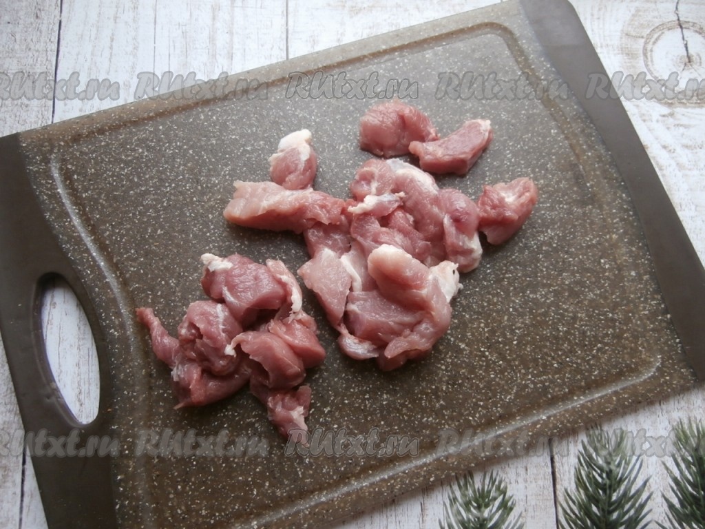 Нарезать на небольшие кусочки вымытую свинину.