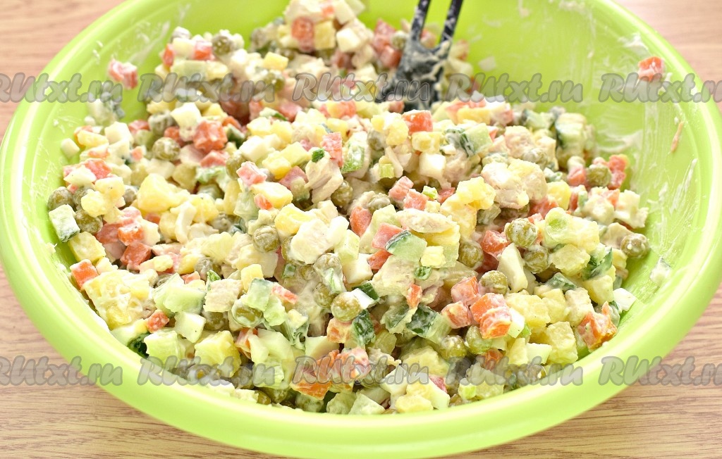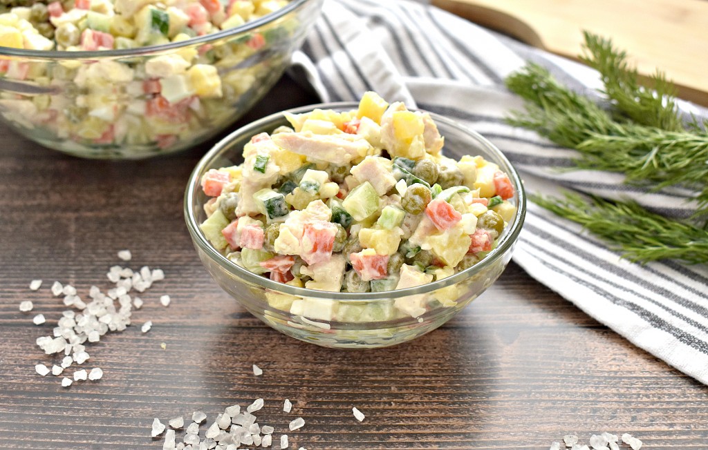 Очень вкусный, яркий салат «Столичный», приготовленный с курицей и свежим огурцом, ставим минут на 20-30 в холодильник, а после охлаждения подаём к столу. Из предложенного количества ингредиентов получается 4 порции.