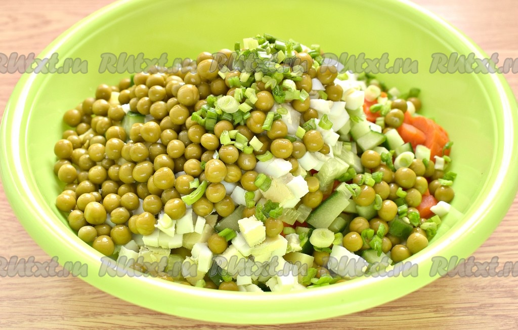 С зелёного горошка сливаем жидкость, переложив его на сито. Зелёный лук промываем, нарезаем, а затем вместе с горошком добавляем в салат.
