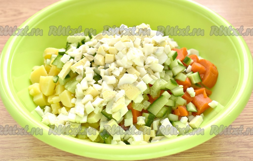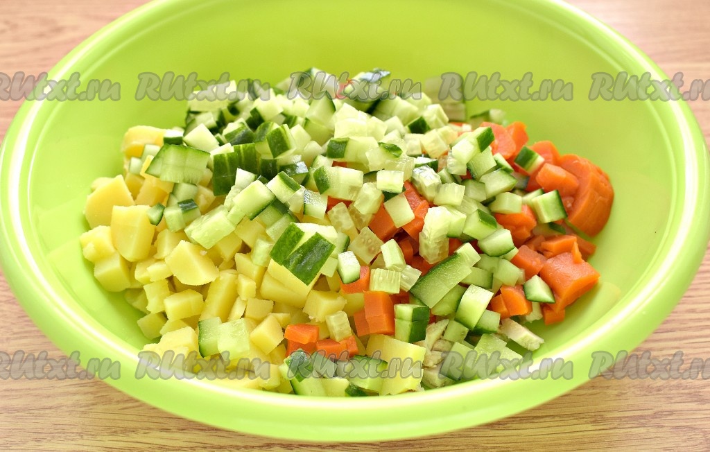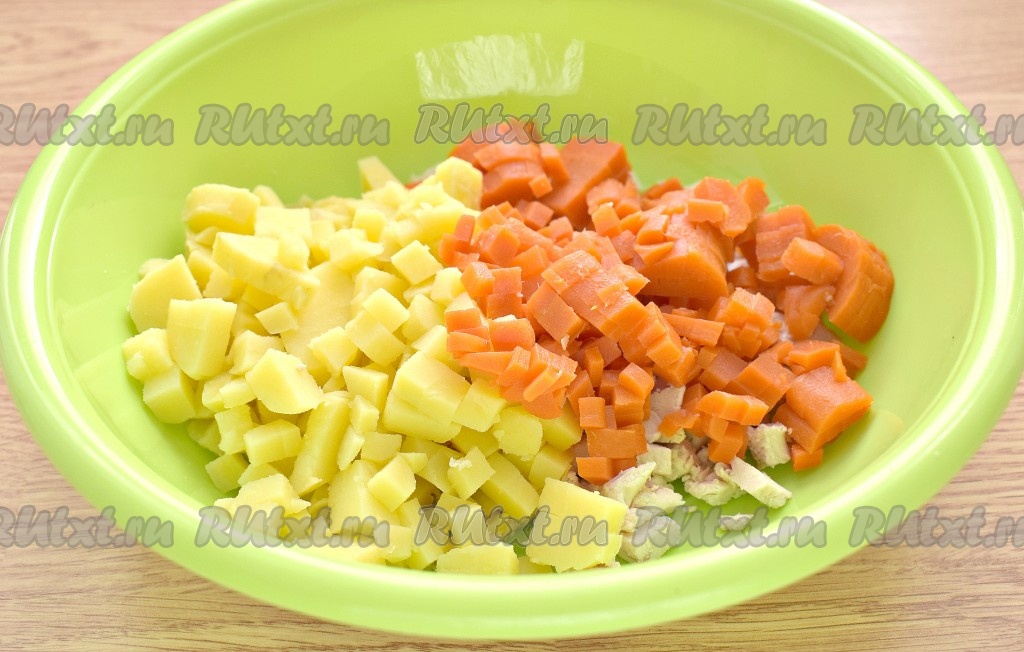Картофель и морковку тоже нарезаем на мелкие кубики, перекладываем в миску с курицей. Вообще, стараемся, чтобы все ингредиенты для салата "Столичный" были нарезаны, примерно, одинаково.