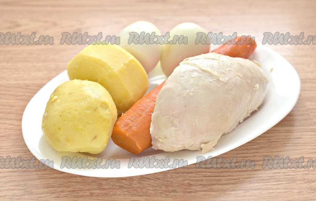 Отвариваем куриное филе в подсоленной воде (варим после закипания 30 минут), затем остужаем. Промываем картофель и морковь, очищать корнеплоды не нужно. Отвариваем картофель после закипания воды в течение 20-25 минут, морковь - около 30 минут. Отвариваем яйца в течение 10 минут после закипания. Остужаем картошку, морковку и яйца, очищаем.