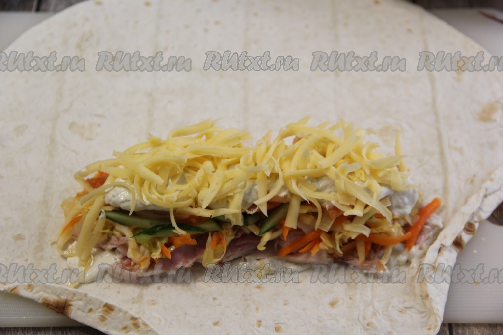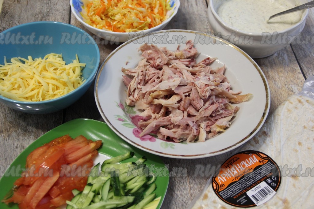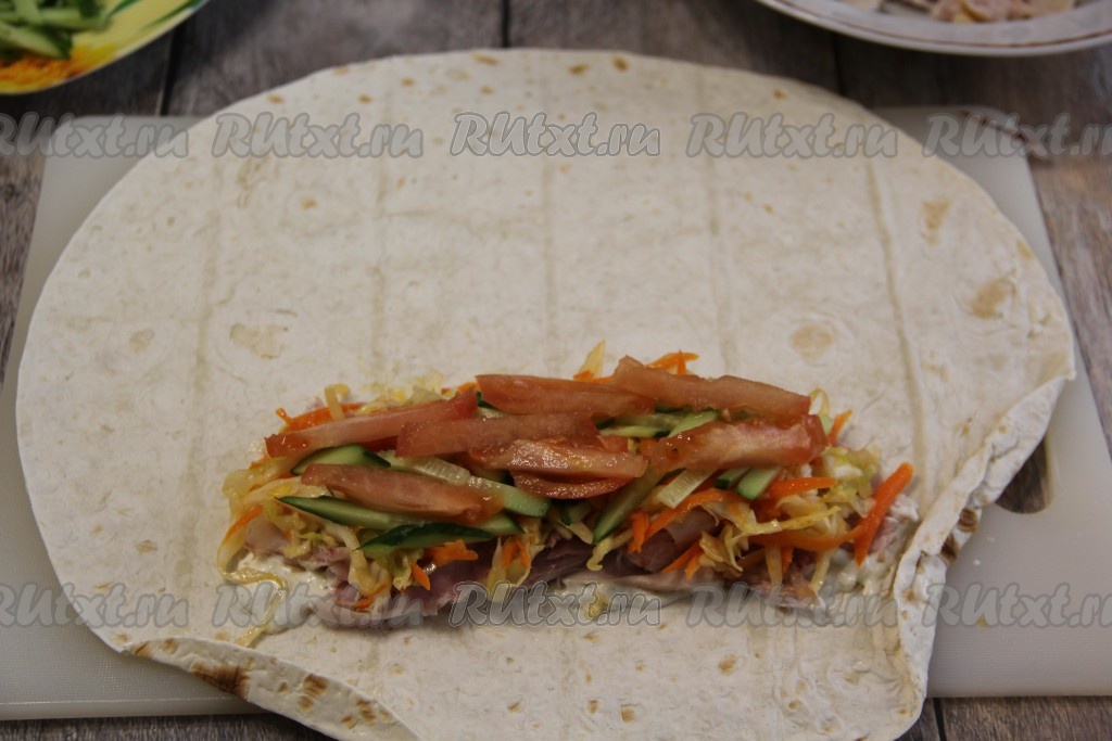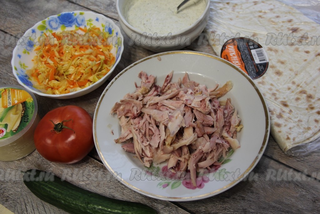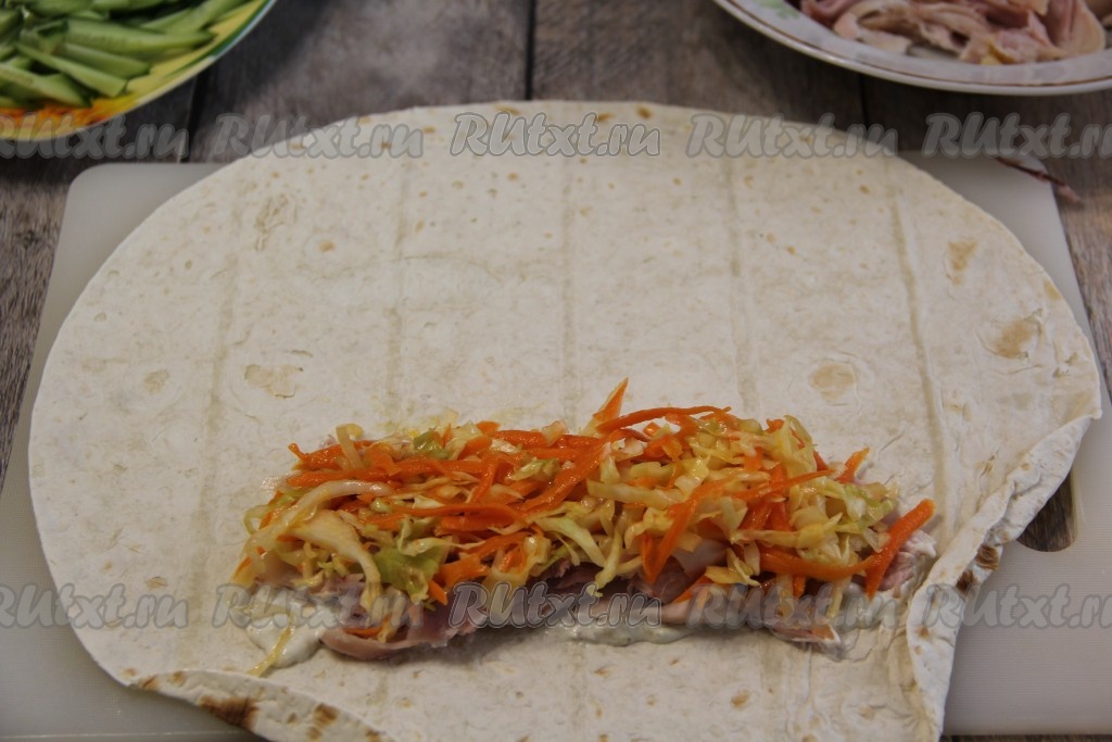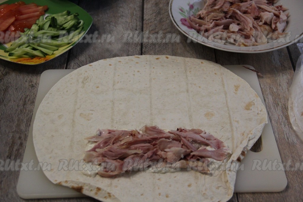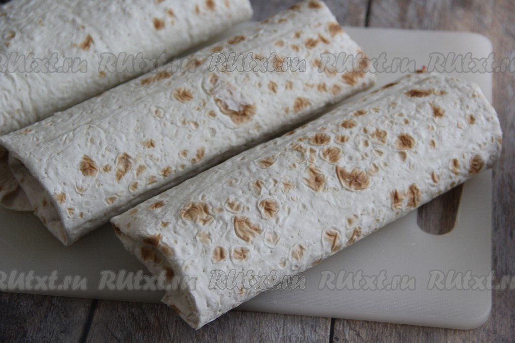 Завернуть начинку в лаваш в виде плоского рулета, сперва подвернув боковые края. Аналогично сформировать ещё 2 шаурмы.