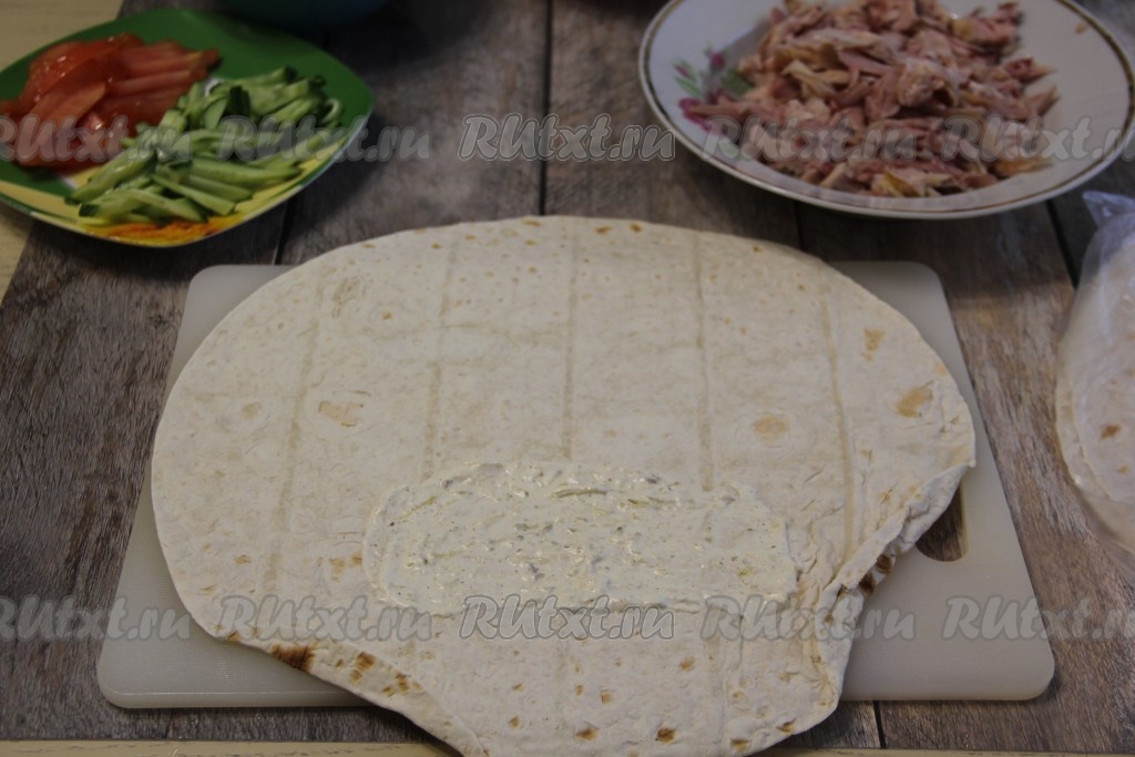 Теперь можно приступать к формированию шаурмы. Так как из указанных ингредиентов мы готовим три шаурмы, следовательно начинку делим тоже на три части. Слегка отступив от края лаваша, смазать часть лаваша (как на фото) немного соусом.