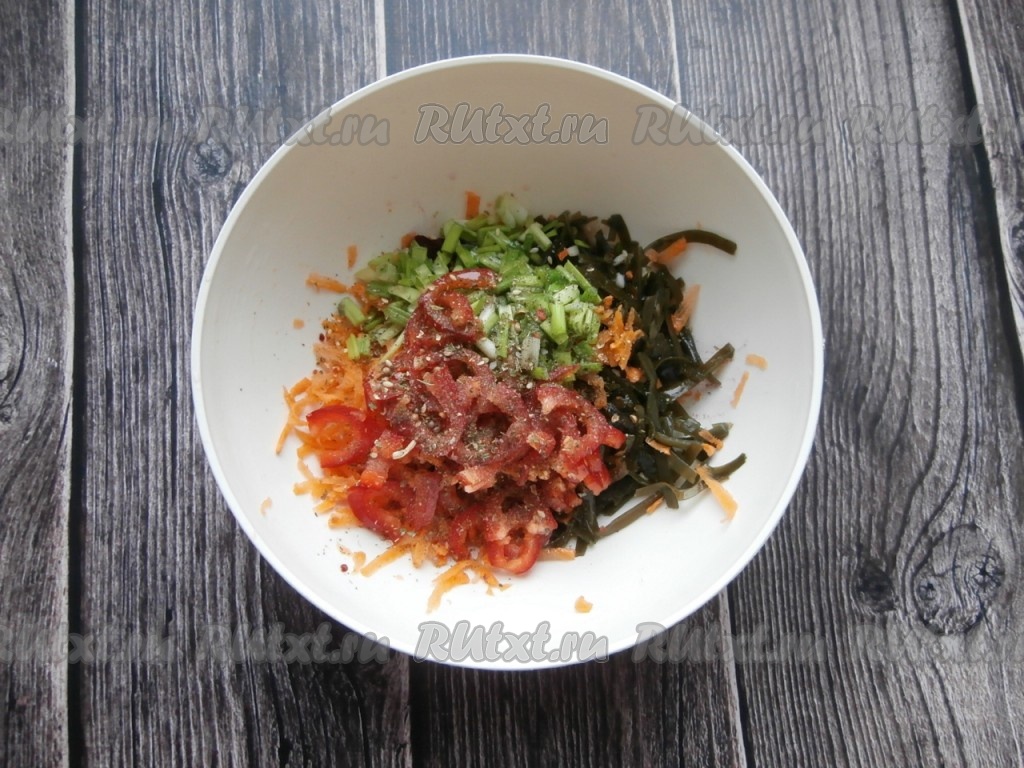 Сюда же добавить нарезанный соломкой сладкий перец, предварительно очищенный от семечек, всыпать соль, приправу для салатов и чёрный молотый перец.
