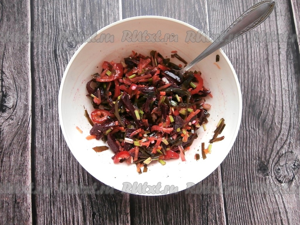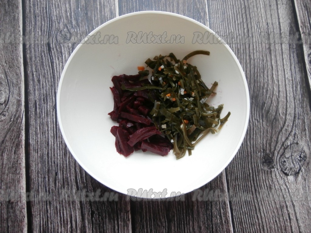 Заранее отварить в кожуре свеклу (мне на отваривание свеклы с момента закипания воды потребовалось 45 минут), затем остудить её, очистить, нарезать тонкими брусочками и выложить в миску. Добавить морскую капусту.