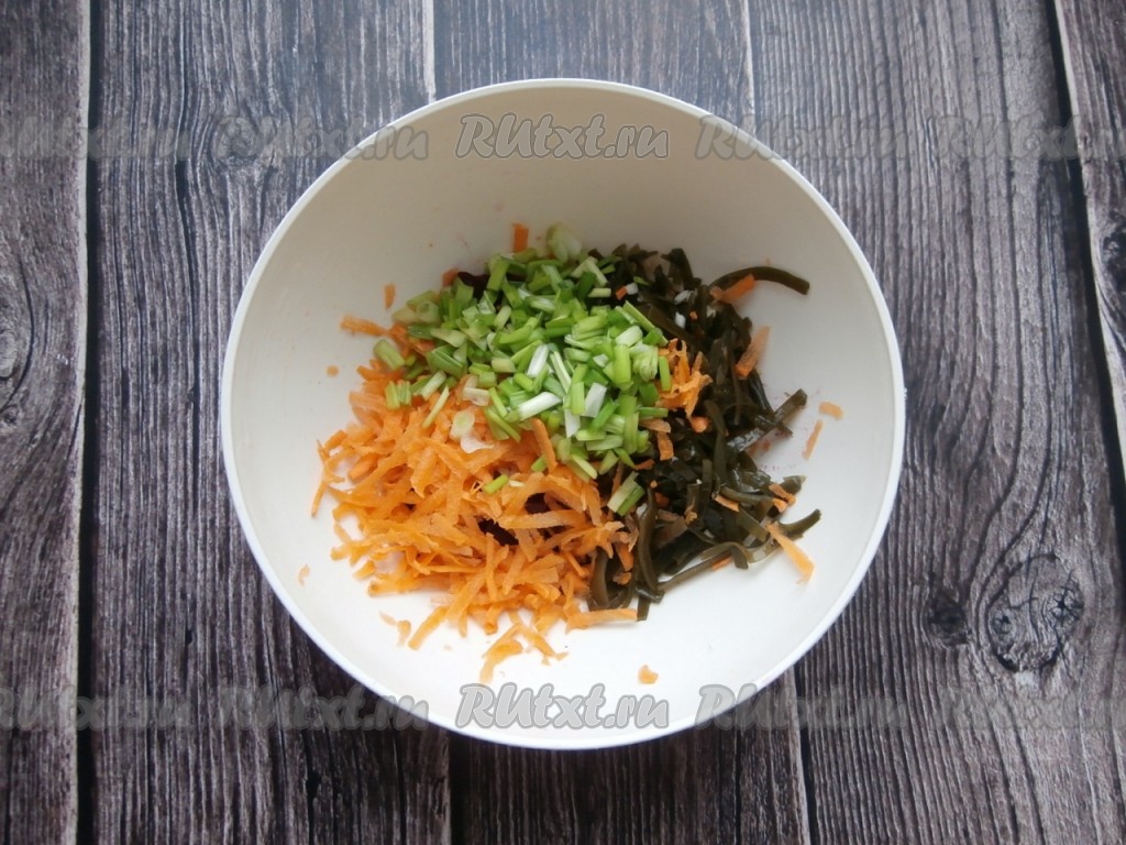 Половину свежей морковки очистить. Зелёный лук вымыть. Добавить натёртую на крупной тёрке морковку и измельчённый зелёный лук в салат из варёной свеклы и морской капусты.