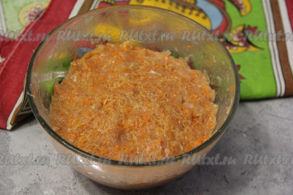 Подготовить продукты. Можно использовать готовый куриный фарш, я пропустила через мясорубку куриное филе. Морковь, картошку и лук почистить. Картошку и морковку натереть на мелкой тёрке. Лук измельчить в измельчителе (или пропустить через мясорубку).