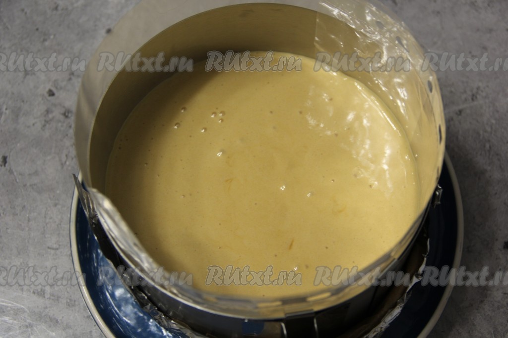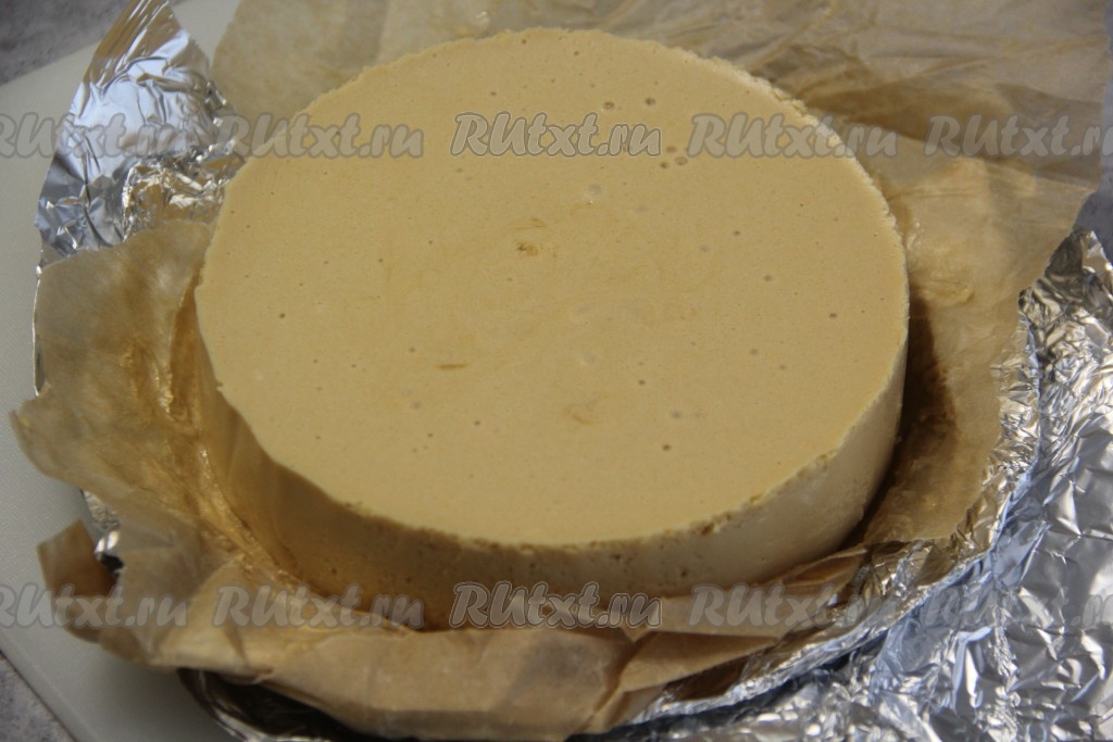 Предварительно подготовить форму (у меня разъёмные бортики без дна диаметром 18 см). Подходящее по размерам плоское блюдо я застелила сначала фольгой, а потом пергаментом. На блюдо поставила форму. С внутренней стороны бортики формы выложила канцелярским файликом (можно выложить ацетатной плёнкой). Затем прижала фольгу и пергамент к внешней стороне бортиков формы. И в подготовленную форму выложила получившуюся взбитую массу.