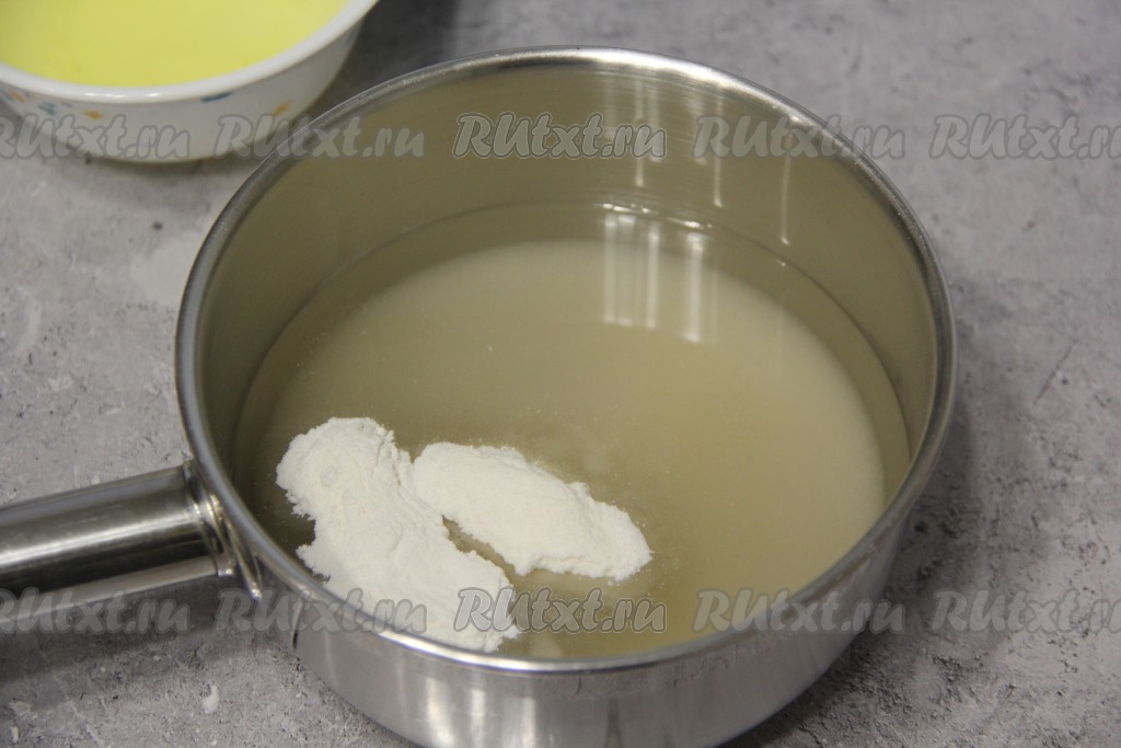 В сотейнике соединить сахар, воду и агар-агар, перемешать сироп венчиком и поставить на огонь.
