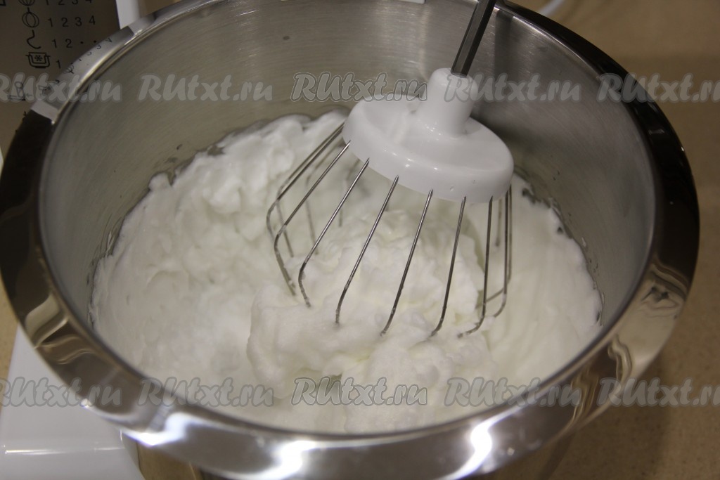 Взбивать белки миксером до появления воздушных пиков.