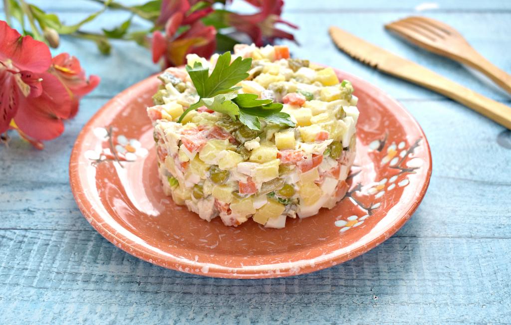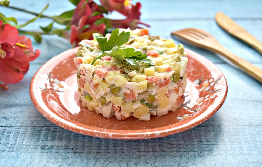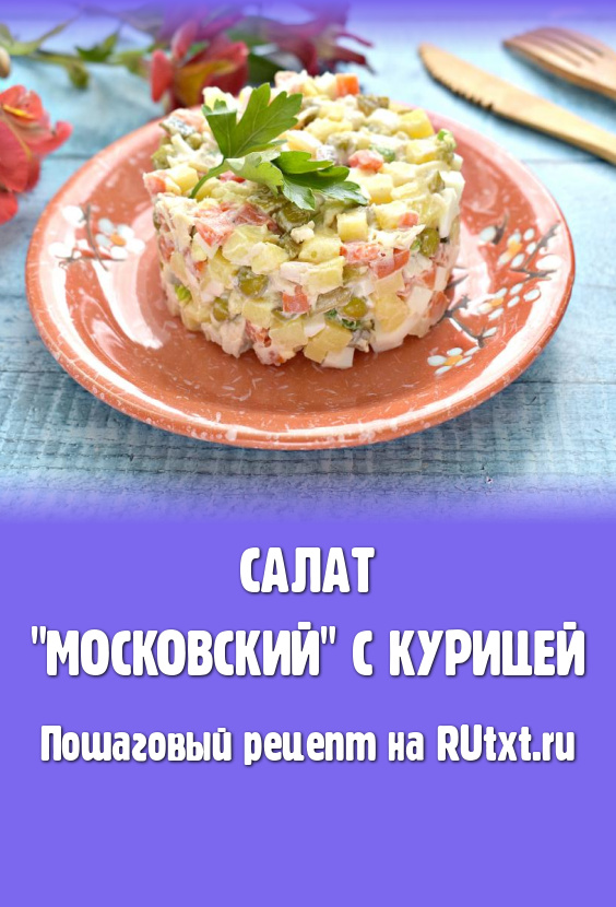 История салата "Московский" началась в советские времена. Этот салатик готовили многие хозяйки, присутствовал он и в меню ресторанов, кафе. Состав блюда достаточно простой и очень похож на состав любимого многими салата "Оливье". Вариаций этого салатика немало, мне нравится салат "Московский", приготовленный с курицей. Блюдо по этому рецепту получается и очень аппетитным, и вкусным, и сытным. Его можно предложить на праздничный стол, да и в будние дни я часто готовлю салат "Московский".
