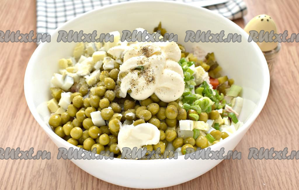 Содержимое салатника по вкусу солим, перчим. Заправляем салат майонезом. При желании, майонез частично или полностью можно заменить на сметану.