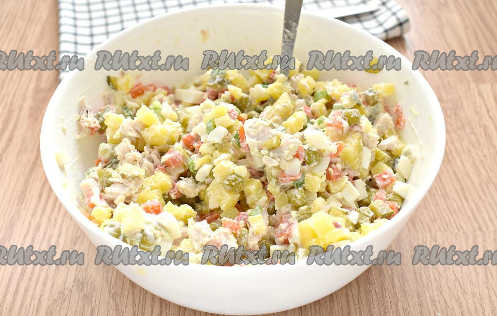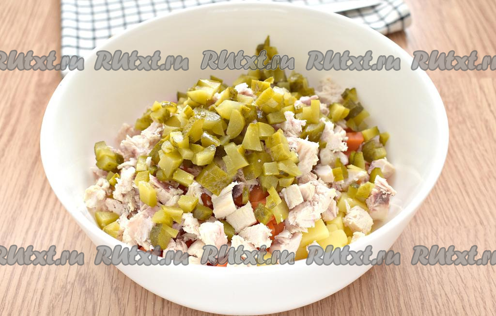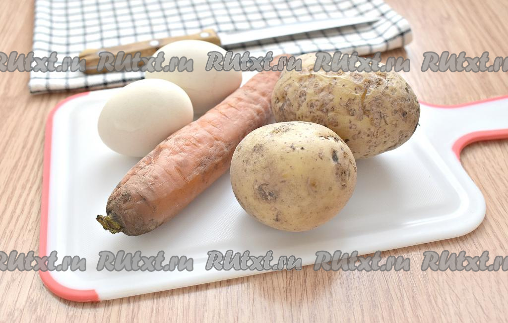 Отвариваем куриное филе в течение 25 минут после закипания. Кстати, вместо филе можно отварить бёдра, голени, которые после остывания нужно отделить от костей. Картофель и морковку хорошо промываем, отвариваем в кожуре после закипания в течение 25 минут. Яйца тоже отвариваем (на варку потребуется минут 10 после закипания воды). Отваренные яйца, мясо и овощи нужно полностью остудить. Яйца, морковку и картошку очищаем.