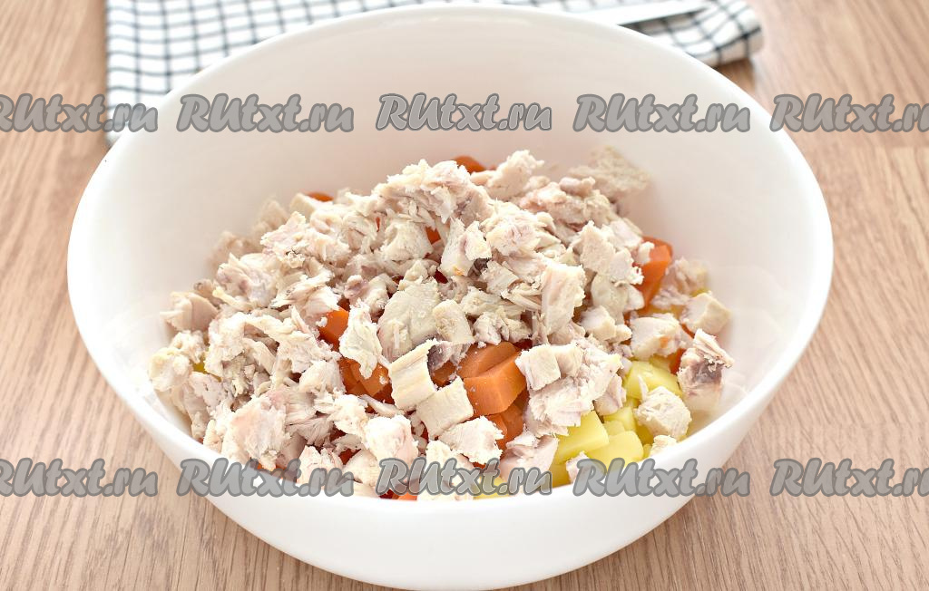 Куриное мясо нарезаем на мелкие кусочки, добавляем в салатник.