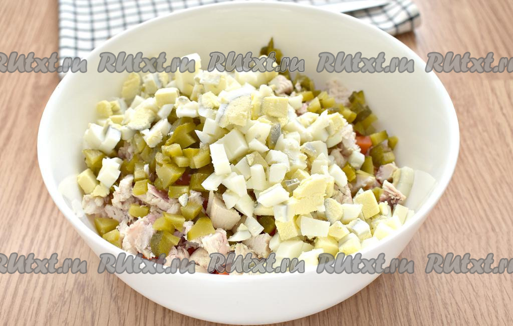 Сюда же выкладываем и варёные яйца, нарезанные на маленькие кубики.