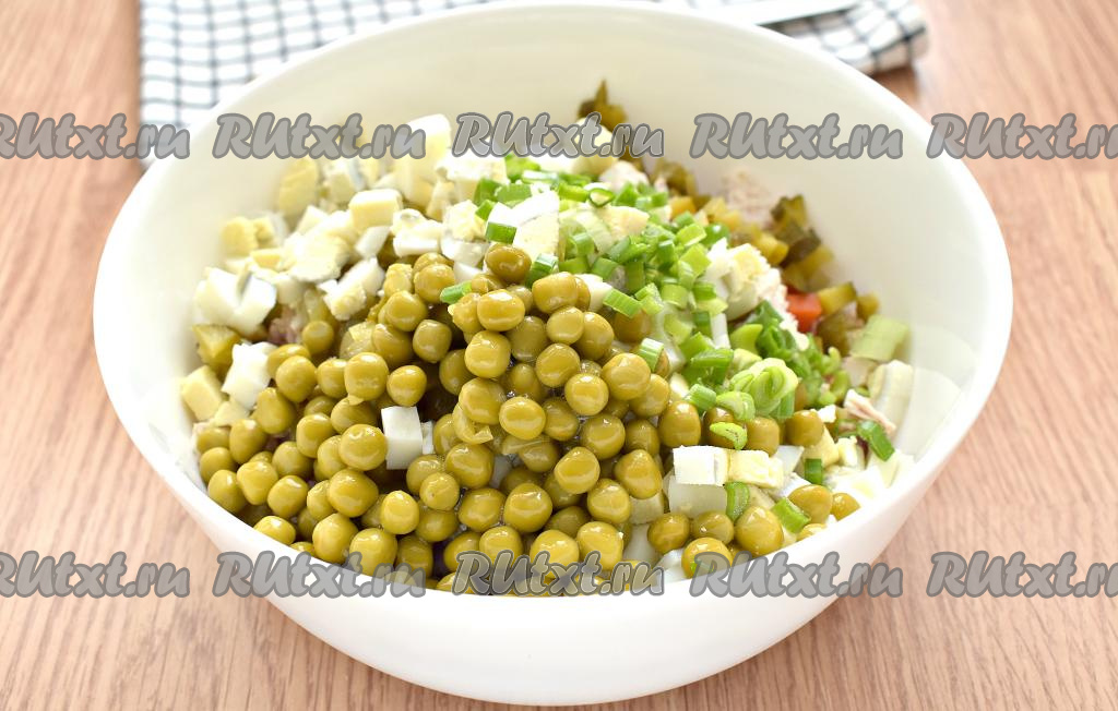 Откидываем зелёный консервированный горошек на сито, чтобы убрать лишнюю жидкость. Зелёный лук нарезаем мелко и вместе с горошком добавляем в салатник.