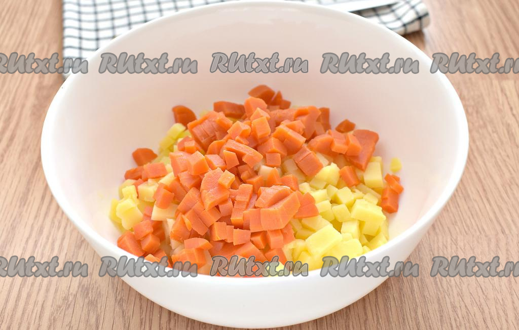 На мелкие кубики нарезаем и морковку, перекладываем к картошке.