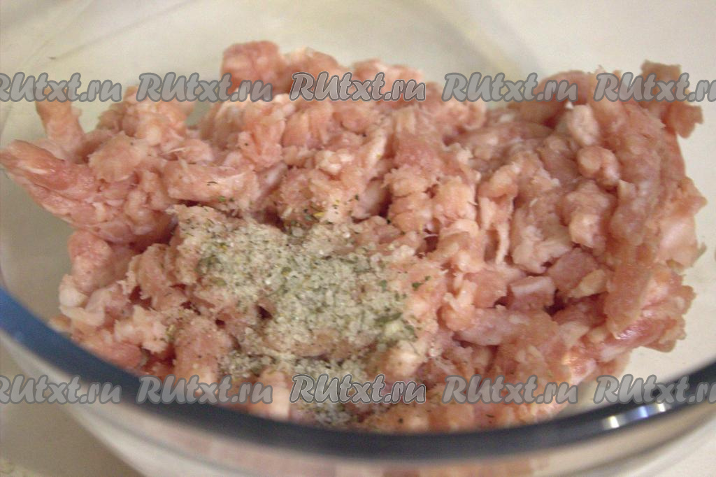 Для получения фарша пропустить кусочки мяса через мясорубку (я использовала покупной фарш из свинины и говядины), выложить в удобную миску, посолить, всыпать специи по вкусу, хорошо перемешать.