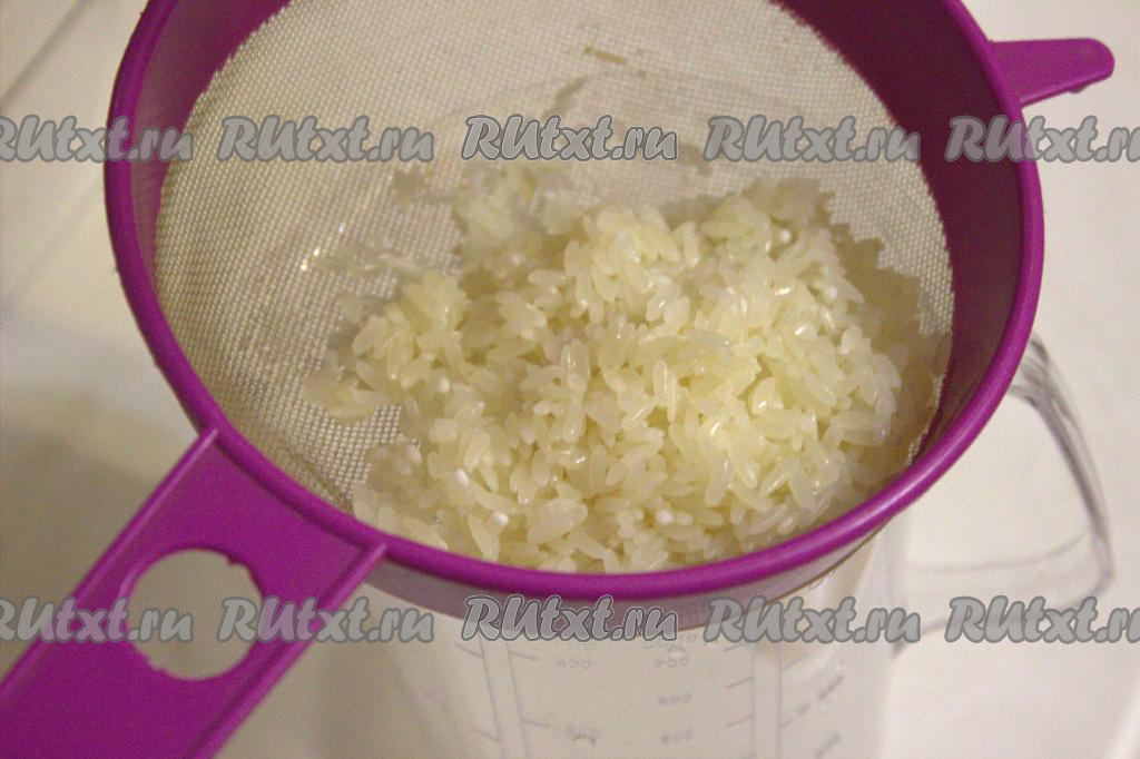 Хорошо промыть рис. Промытый рис поместить в удобную миску, залить полностью кипятком и оставить минут на 20-25. Затем отбросить рис на сито и оставить на некоторое время, для того чтобы полностью стекла вода.