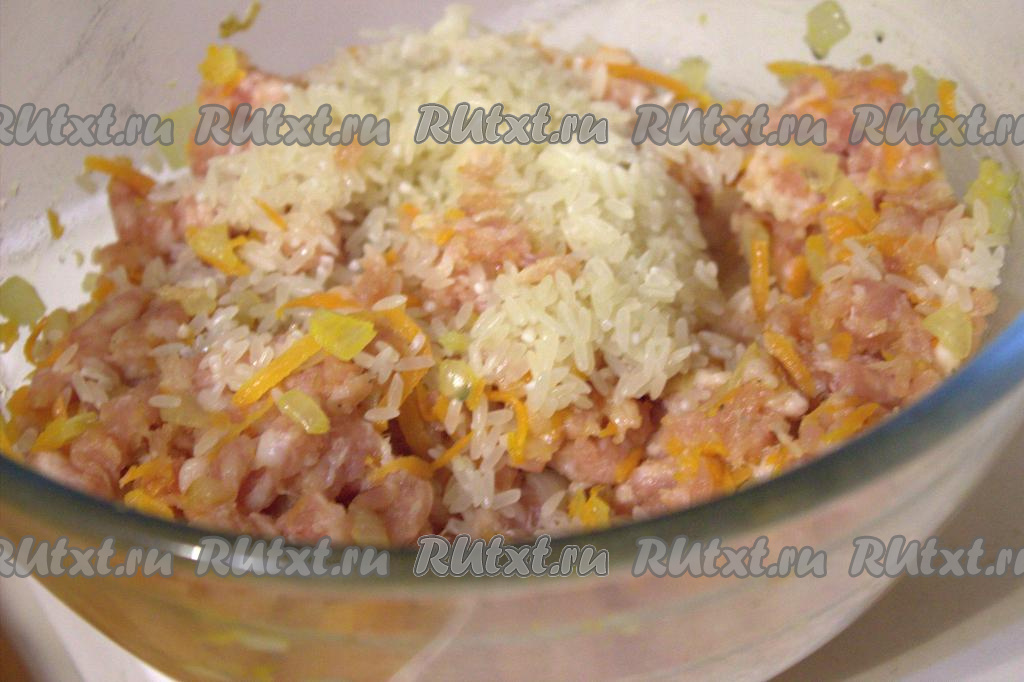 В фарш добавить обжаренные и уже остывшие лук с морковью, всыпать рис.