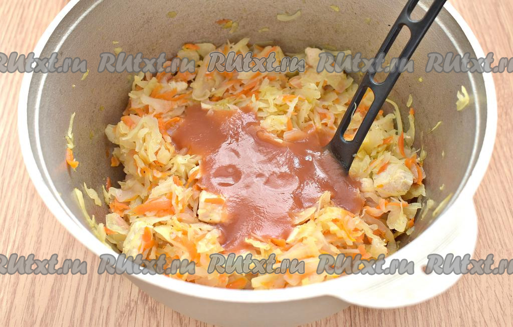 Тушим капусту с курицей 20 минут под крышкой, иногда помешивая. Томатную пасту разводим 2-3 столовыми ложками кипятка, добавляем в казан, перемешиваем.