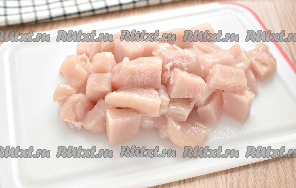 Филе (или мясо, срезанное, например, с куриных бёдер, голеней) нарезаем на средние кусочки.