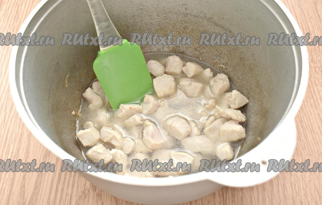 Убавляем нагрев плиты до чуть ниже среднего, аккуратно вливаем к куриным кусочкам 100 мл кипятка. Прикрываем казан крышкой и тушим курицу 10 минут.