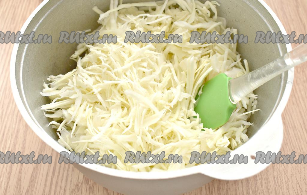 Добавляем в казан тонко нашинкованную капусту. Перемешиваем, готовим дальше вместе с курицей 7 минут, иногда помешивая. Крышка должна быть немного приоткрыта.